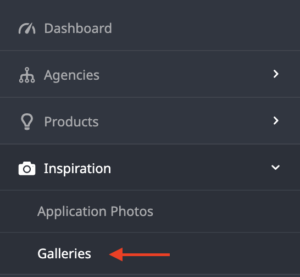 Advanced Web Manufacturers can create project galleries to showcase project applications & spaces to the design community directly on their website. You can access this feature by expanding the “Inspiration” tab in the sidebar navigation, then selecting “Galleries”.