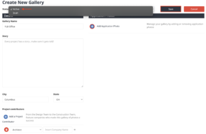 To create a new gallery, click on the Add New Gallery+ button. Then enter the gallery details including Gallery Name, Story, City, State and any Project Contributors that you would like to credit.