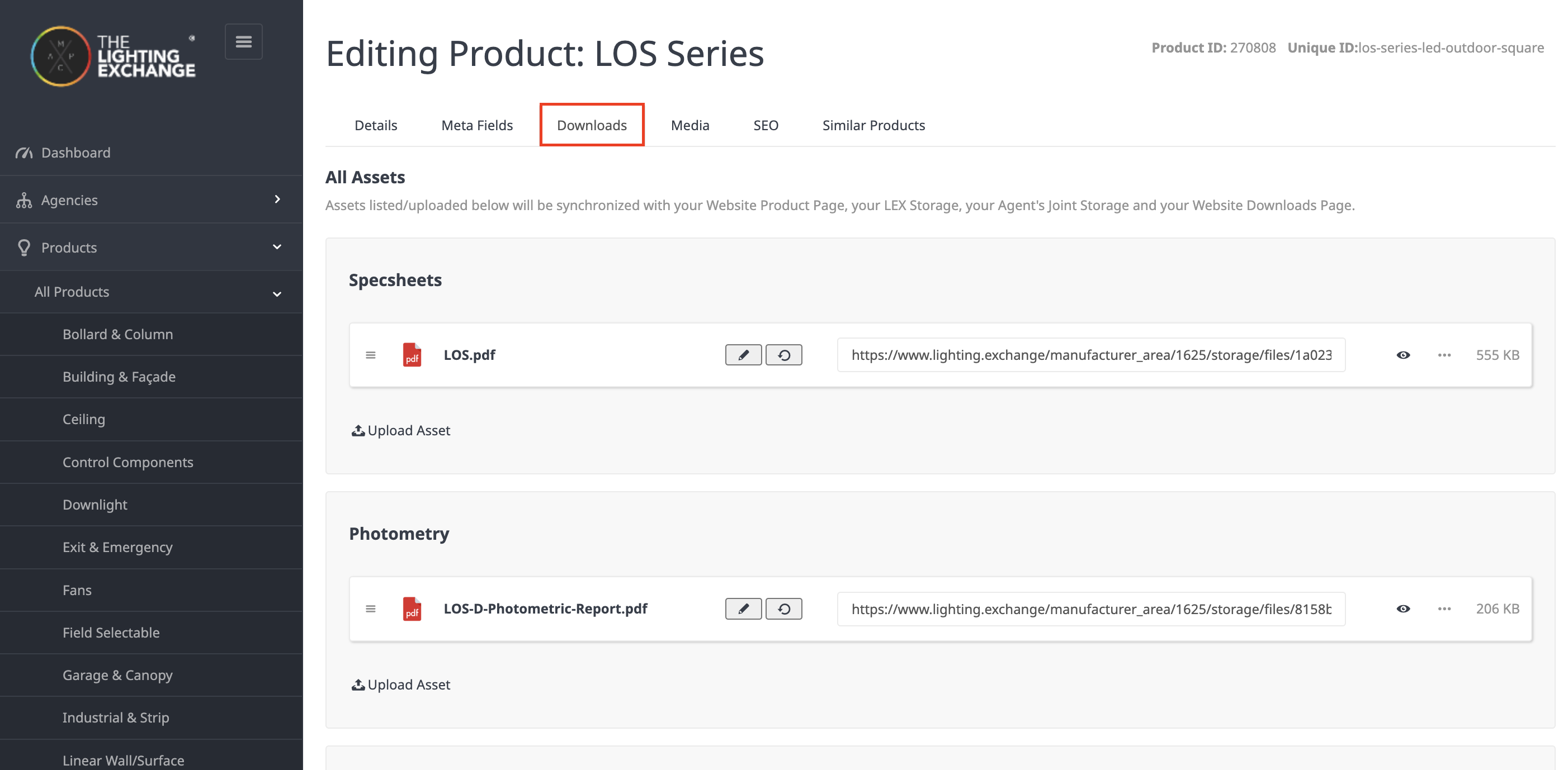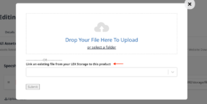 To add these documents please navigate to the Downloads tab of the Editing Product page, and clicking ‘Upload Asset’ under each section to add as many documents as you’d like. You can either upload a document, or select a document that’s already been uploaded to your LEX Storage.